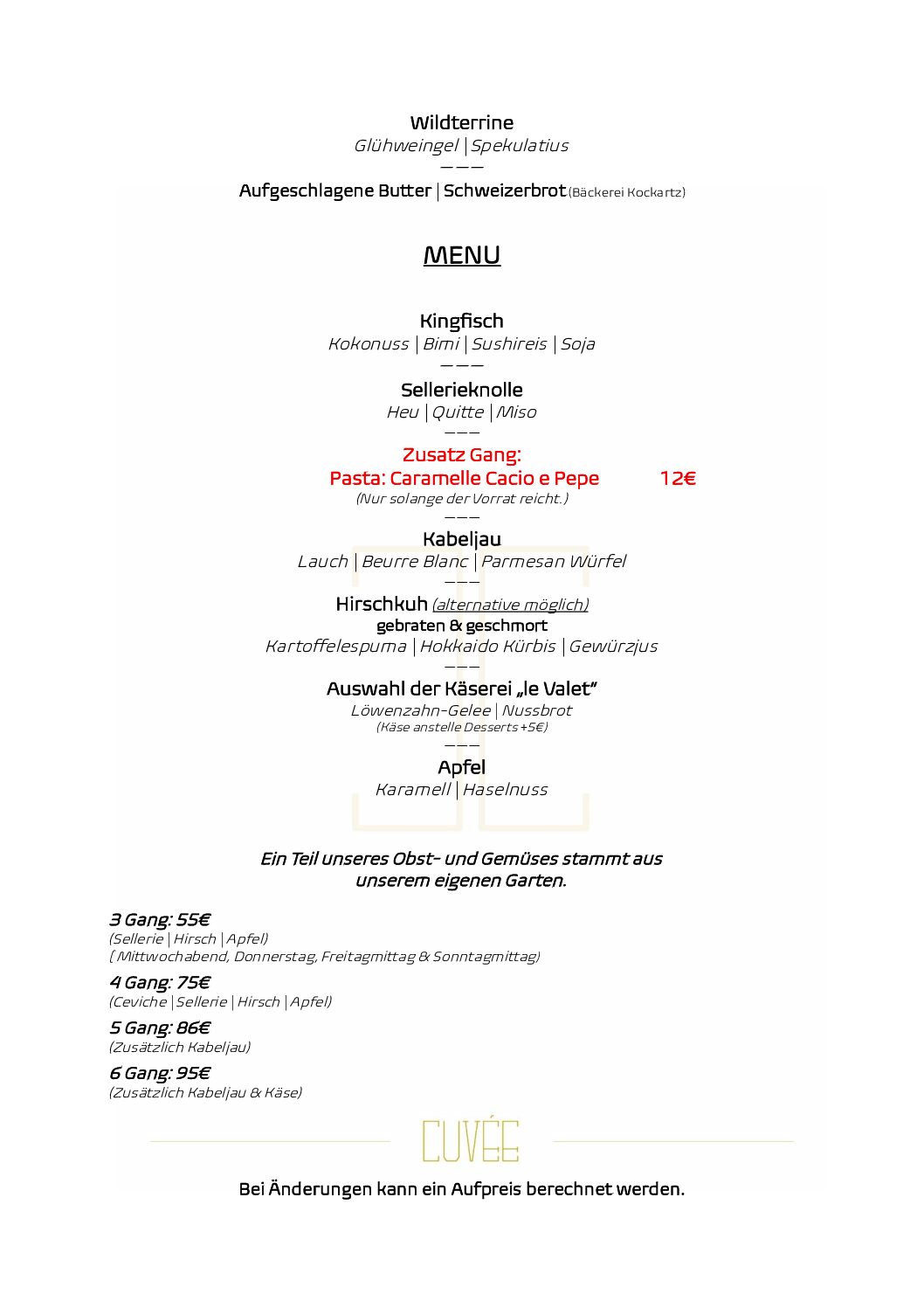 Im Cuvée bieten wir ein Menü an, welches fließend mit Saison und Jahreszeit ändert. Unser Menü kann in 4-5-6 Gänge serviert werden. Unsere Philosophie gründet sich auf drei wesentlichen Säulen: Qualität, Verbundenheit zur Region und Liebe zum Beruf.